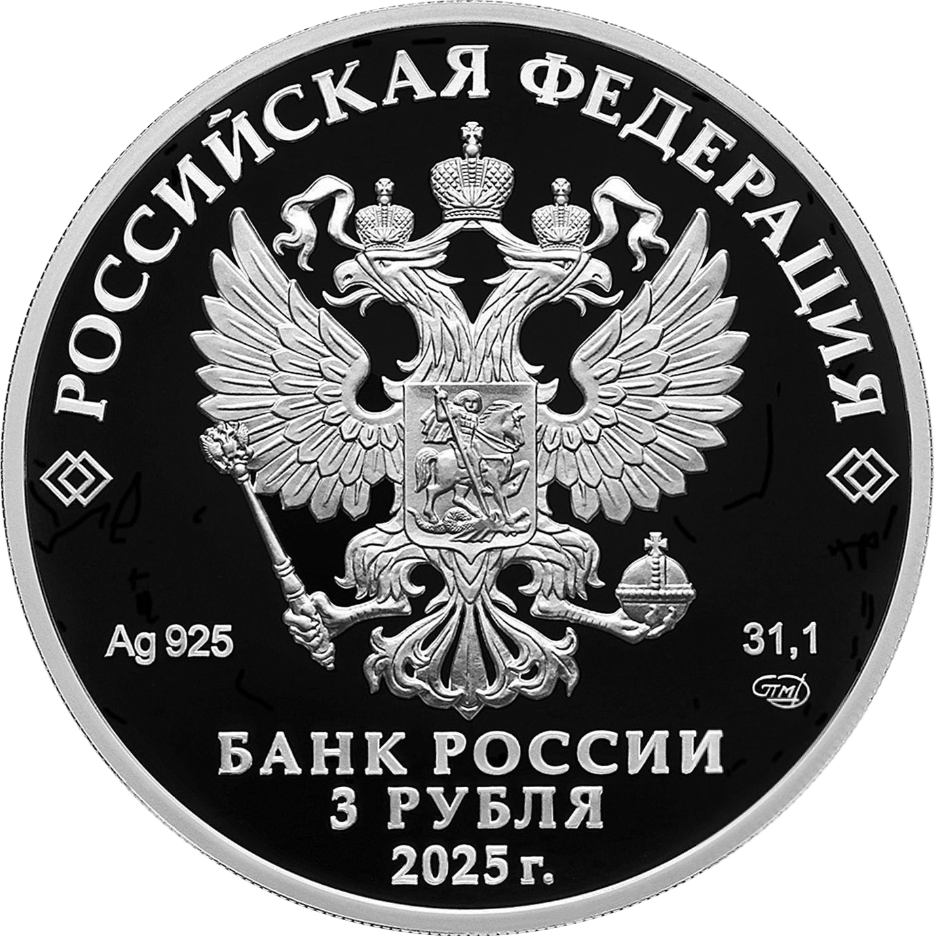 рельефное изображение Государственного герба Российской Федерации, над ним вдоль канта – надпись полукругом «РОССИЙСКАЯ ФЕДЕРАЦИЯ», обрамленная с обеих сторон сдвоенными ромбами, под гербом слева – обозначения драгоценного металла и пробы сплава, справа – содержание химически чистого металла и товарный знак монетного двора, внизу в центре в три строки – надпись «БАНК РОССИИ», номинал монеты «3 РУБЛЯ», год выпуска «2025 г.».