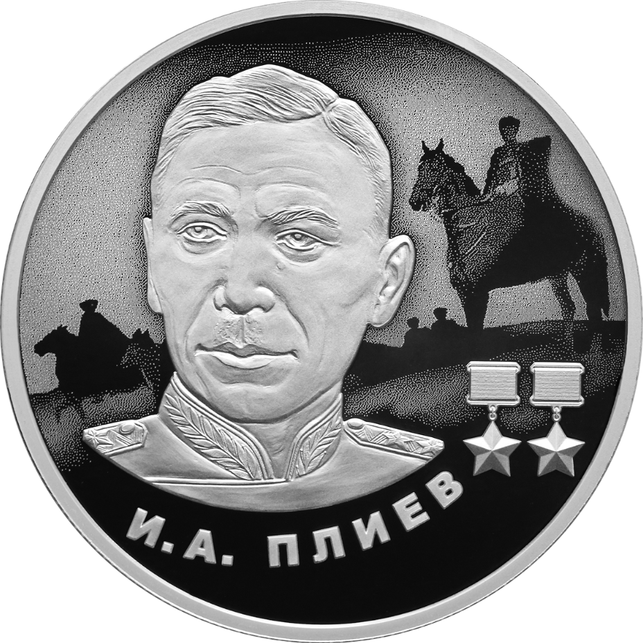 рельефные изображения портрета дважды Героя Советского Союза И.А. Плиева и медалей «Золотая звезда» на фоне выполненных в технике лазерного матирования изображений И.А. Плиева на коне и группы всадников; под портретом – надпись «И.А. ПЛИЕВ».
