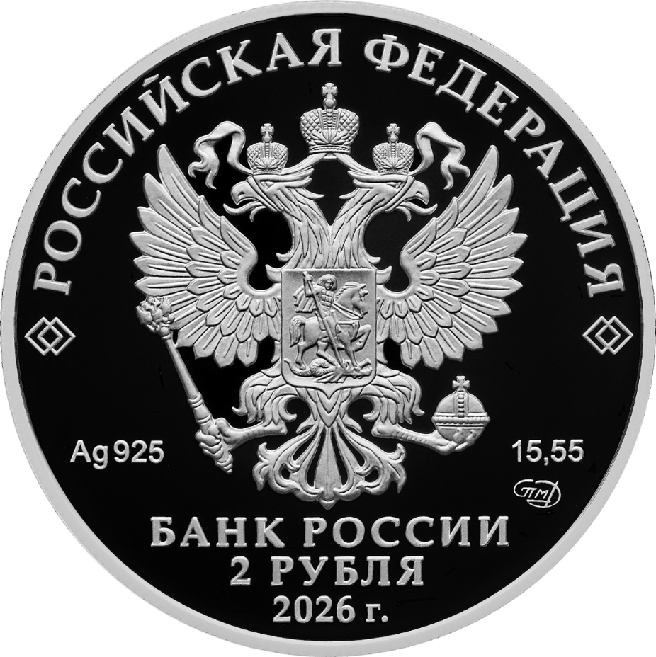 рельефное изображение Государственного герба Российской Федерации, над ним вдоль канта – надпись полукругом «РОССИЙСКАЯ ФЕДЕРАЦИЯ», обрамленная с обеих сторон сдвоенными ромбами, под гербом слева – обозначения драгоценного металла и пробы сплава, справа – содержание химически чистого металла и товарный знак монетного двора, внизу в центре в три строки – надпись «БАНК РОССИИ», номинал монеты «2 РУБЛЯ», год выпуска «2026 г.».