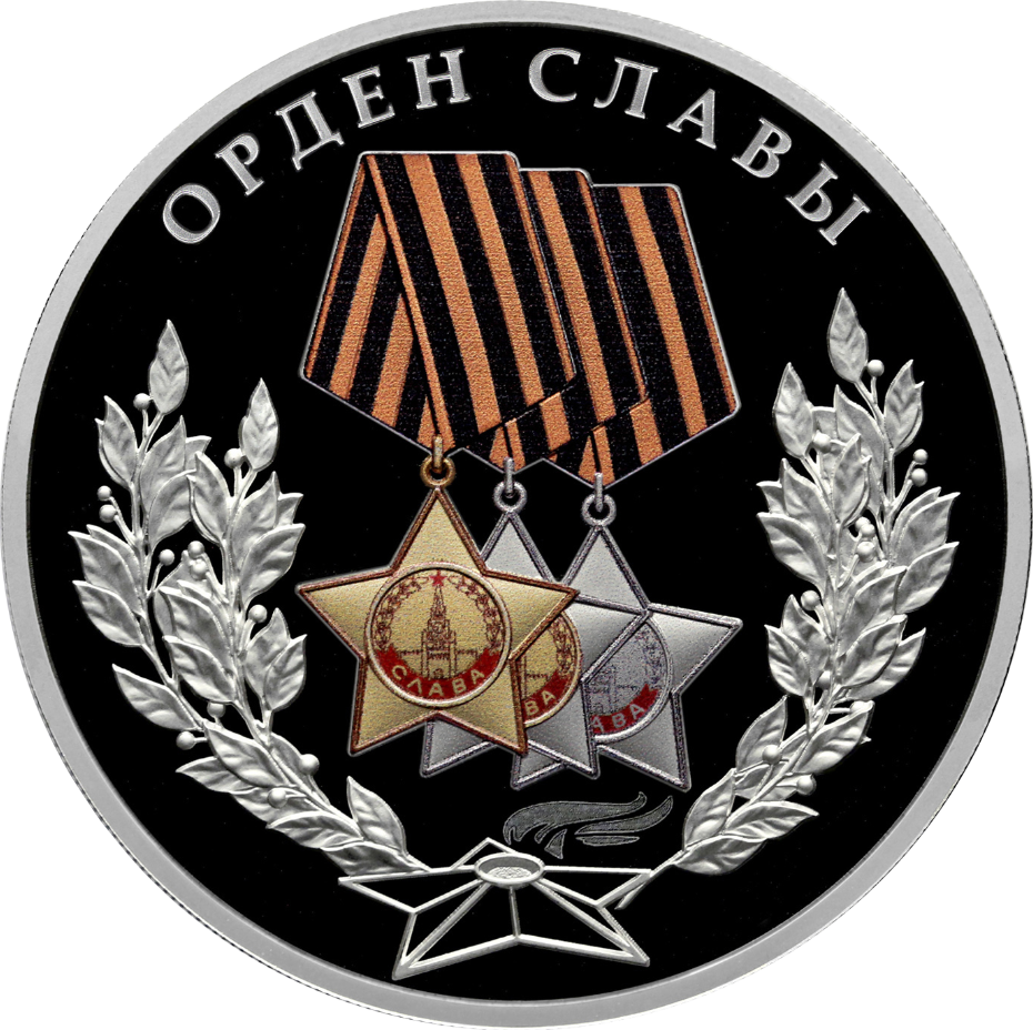 выполненное в рельефе и цвете изображение ордена Славы I, II и III степени, под ним – рельефные изображения Вечного огня на Могиле Неизвестного Солдата и лавровых ветвей; вверху по окружности – надпись «ОРДЕН СЛАВЫ».