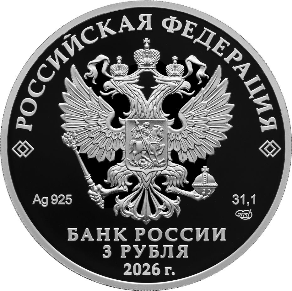 рельефное изображение Государственного герба Российской Федерации, над ним вдоль канта – надпись полукругом «РОССИЙСКАЯ ФЕДЕРАЦИЯ», обрамленная с обеих сторон сдвоенными ромбами, под гербом слева – обозначения драгоценного металла и пробы сплава, справа – содержание химически чистого металла и товарный знак монетного двора, внизу в центре в три строки – надпись «БАНК РОССИИ», номинал монеты «3 РУБЛЯ», год выпуска «2026 г.».