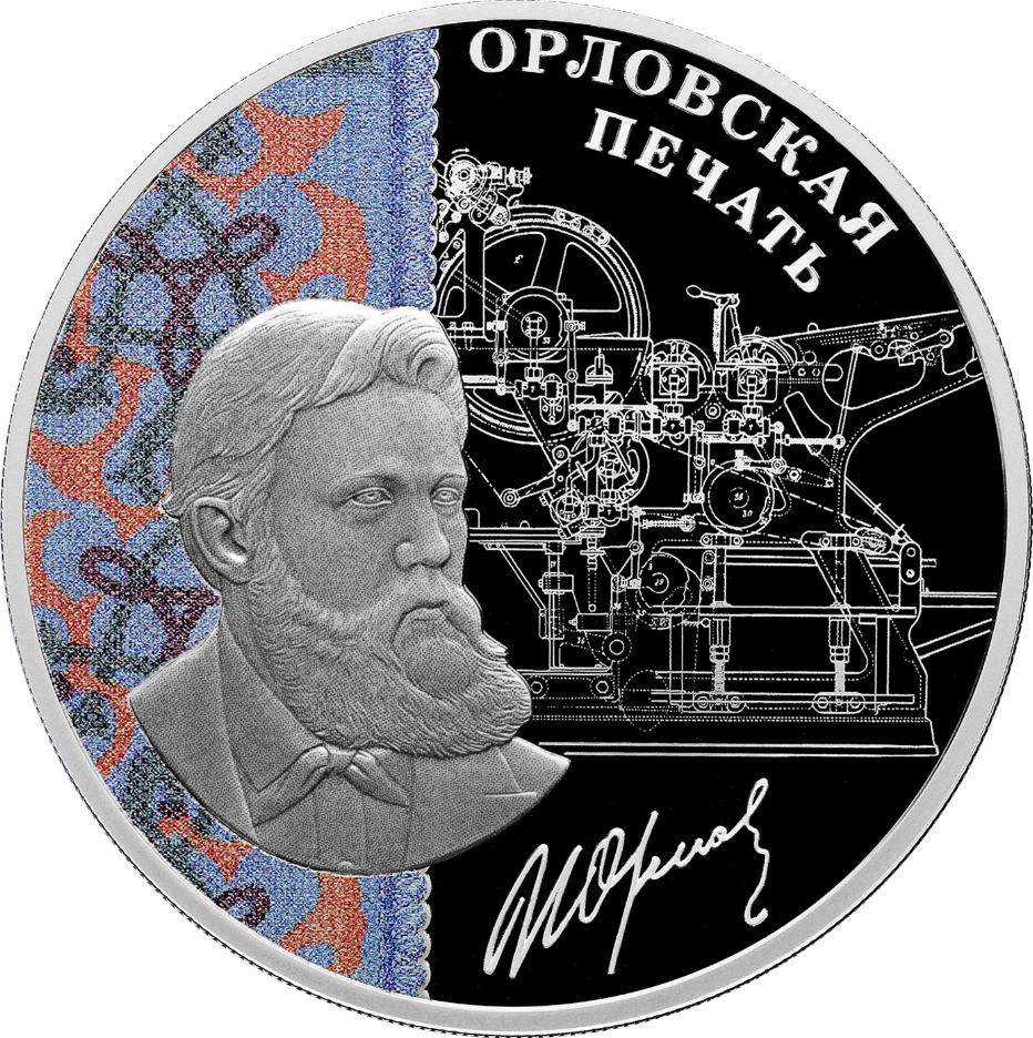рельефное изображение портрета И.И. Орлова на фоне выполненного в технике лазерного матирования изображения чертежа печатного станка, созданного Орловым, и цветного орнаментального покрытия, имитирующего орловскую печать; справа вверху в две строки – надпись «ОРЛОВСКАЯ ПЕЧАТЬ», внизу – факсимиле подписи И.И. Орлова.