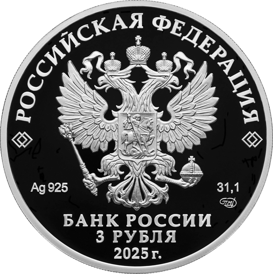рельефное изображение Государственного герба Российской Федерации, над ним вдоль канта – надпись полукругом «РОССИЙСКАЯ ФЕДЕРАЦИЯ», обрамленная с обеих сторон сдвоенными ромбами, под гербом слева – обозначения драгоценного металла и пробы сплава, справа – содержание химически чистого металла и товарный знак монетного двора, внизу в центре в три строки – надпись «БАНК РОССИИ», номинал монеты «3 РУБЛЯ», год выпуска «2025 г.».
